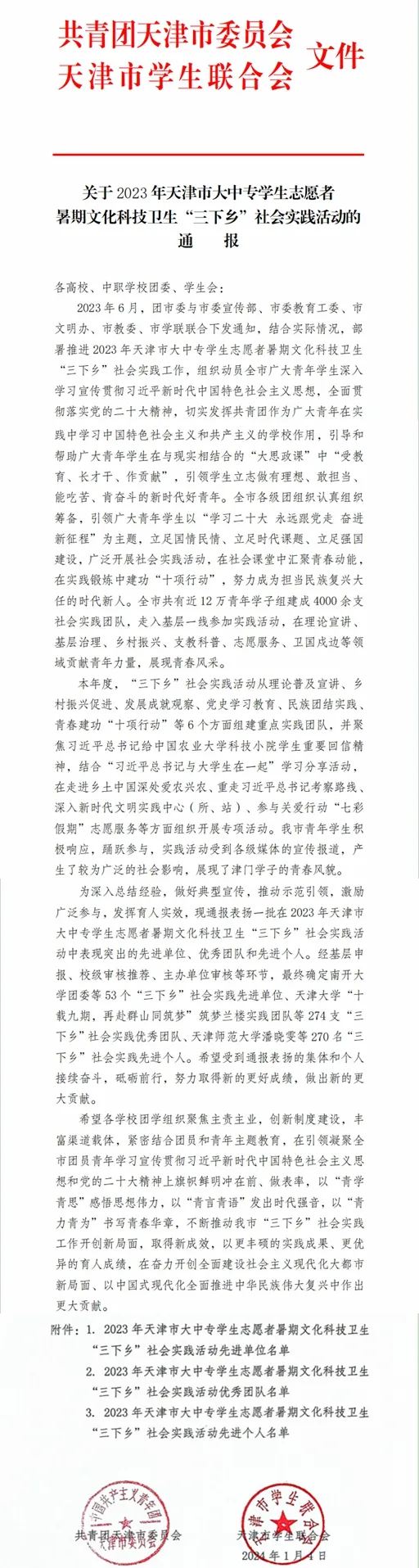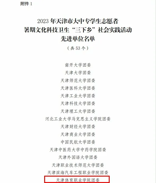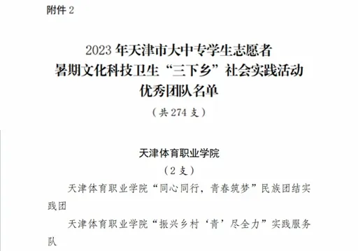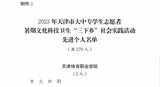 日前,共青团天津市委员会🔽、天津市学生联合会对在2023 年天津市大中专学生志愿者暑期文化科技卫生“三下乡”社会实践活动中表现突出的先进单位、优秀团队和先进个人进行通报表扬,我院荣获多项荣誉。其中,学院团委组建的“同心同行🧙🏼♂️,青春筑梦”民族团结实践团(带队教师张强)⚈、“振兴乡村‘青’尽全力”实践服务队(带队教师李元)获评优秀团队,院团委委员李元、体育保健与康复系2021级2班学生和玥获评先进个人💆,我院获评先进单位。