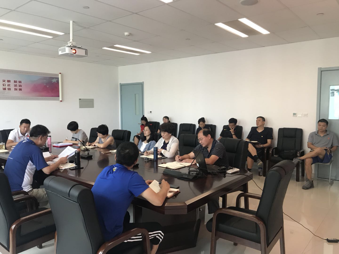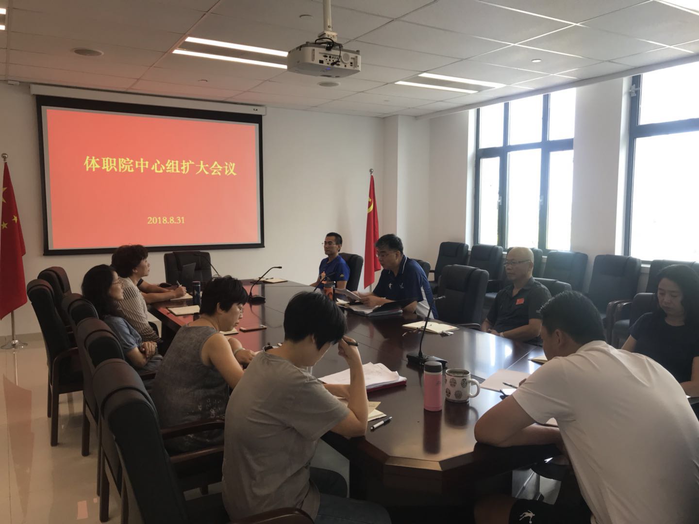 2018年8月31日,体职院在二楼会议室召开中心组扩大会议,学院党委书记王伟出席并主持🧑🏻🦼➡️,学院各处室、系部负责人,各党支部书记参加。