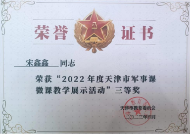 在天津市教育委员会和天津警备区战备建设局联合举办的2022年度天津市军事课微课教学展示活动中,我院辅导员宋鑫鑫老师的展示作品《人民军队的光辉战斗历程》荣获大学组三等奖👳🏼♀️。